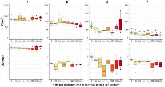 Fungal alpha diversity indices of soil, root, stem and leaf samples of poplar grown along a phenanthrene contamination gradient. (a) Soil (b) roots (c) stems and (d) leaves data. The indices (Shannon diversity and Chao1 richness) were calculated using the Phyloseq package on R. The data represents the distribution of measured parameters from three to four plant replicates per condition. Different letters indicate significant differences (p < 0.05) after Dunn’s post-hoc test.