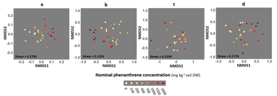 Non-metric multidimensional scaling (NMDS) ordination of fungal community composition associated with the rhizosphere soil, and the roots, stems and leaves of poplar grown along a phenanthrene contamination gradient. (a) Soil (b) roots (c) stems and (d) leaves data. Plots were drawn using the Bray-Curtis dissimilarity measure over 1000 iterations. Each point represents the fungal community of a given sample.