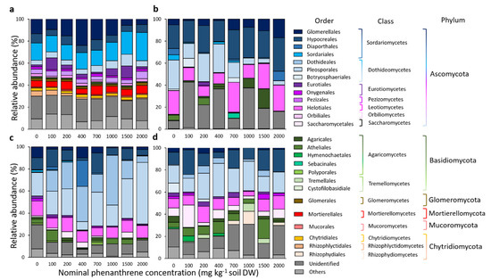 Taxonomic composition of the fungal communities of rhizosphere samples from soil (a), roots (b), stems (c) and leaves (d) of poplar, grown along a phenanthrene contamination gradient. The top 15 most abundant orders are represented, and the remaining diversity was categorized as ‘others’ due to their minor (<5% for soil samples or <1% for plant samples) relative abundances or ‘unidentified’ for non-affiliated taxa. Values are means of three to four replicate samples.