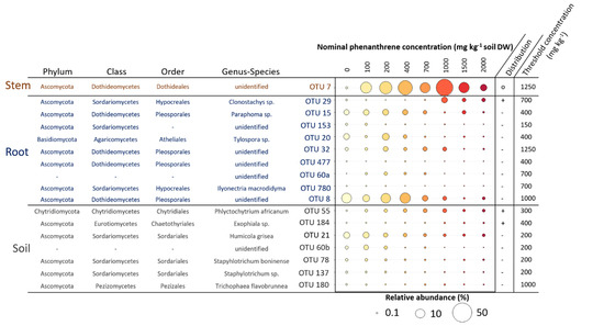 We searched for indicator species (IS) having their relative abundance increasing or decreasing along the PHE gradient in the four compartments studied (Figure 6). We identified a total of 19 OTUs that were significantly impacted by the PHE gradient; seven were found for the soil, nine for the roots, one for the stems. In the soil, five OTUs had their RA decreasing when the PHE concentration increased. The change point for their distribution was at 200 mg PHE kg−1 except for one decreasing from 1000 mg PHE kg−1. These OTUs belonged to the Sordariales (Humicola grisea, Staphylotrichum boninense, Staphylotrichum sp.), to unidentified fungi, and the last to Pezizales (Trichophaea flavobrunnea). The two last soil IS belonged to Chytridiales and Chaetothyriales, with RAs increasing along the gradient from 300–400 mg PHE kg−1. Eight of the IS for the root compartment had their RA decreasing along the PHE gradient at diverse change points from 150 to 1250 mg PHE kg−1 and half belonged to the Pleosporales, one to Hypocreales, and one to Atheliales. Only one IS for the roots belonging to Hypocreales (Clonostachys sp.) had its RA increasing with the PHE concentration (change point at 700 mg PHE kg−1). In the stems, one OTU was identified as IS; it belonged to the Dothideales and its RA, representing 0.3% at 0 mg PHE kg−1, increased up to 54% from 0 to 1000 mg PHE kg−1 and then decreased (change point at 1250 mg PHE kg−1) to 6% at 2000 mg PHE kg−1.