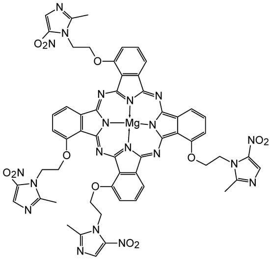 - Wierzchowski, M.; Sobotta, L.; Skupin-Mrugalska, P.; Kruk, J.; Jusiak, W.; Yee, M.; Konopka, K.; Düzgüneş, N.; Tykarska, E.; Gdaniec, M.; et al. Phthalocyanines Functionalized with 2-Methyl-5-Nitro-1H-Imidazolylethoxy and 1,4,7-Trioxanonyl Moieties and the Effect of Metronidazole Substitution on Photocytotoxicity. J. Inorg. Biochem. 2013, 127, 62–72. [Google Scholar] [CrossRef] [PubMed]