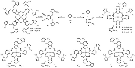 - Michel, S.L.J.; Hoffman, B.M.; Baum, S.M.; Barrett, A.G.M. Peripherally Functionalized Porphyrazines: Novel Metallomacrocycles with Broad, Untapped Potential. In Progress in Inorganic Chemistry; Karlin, K.D., Ed.; John Wiley & Sons, Inc.: New York, NY, USA, 2001; pp. 473–590. ISBN 978-0-471-22711-3. [Google Scholar]