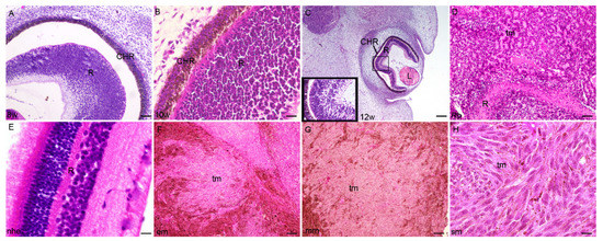 Section through the eye of an 8th-week (8 w) (A), 10th-week (10 w) (B), and 12th week (12 w) (C) human embryo, retinoblastoma (Rb) (D), normal human eye (nhe) (E), epitheloid melanoma (em) (F), mixoid melanoma (mm) (G) and spindle melanoma (sm) (H); R—retina, CHR—choroidea, tm—tumor tissue, L—lens. Hematoxylin and Eosin staining, Scale bar for (A,D) = 50 μm, (B) = 25 μm, (E) = 10 μm, (C,F–H) = 100 μm.