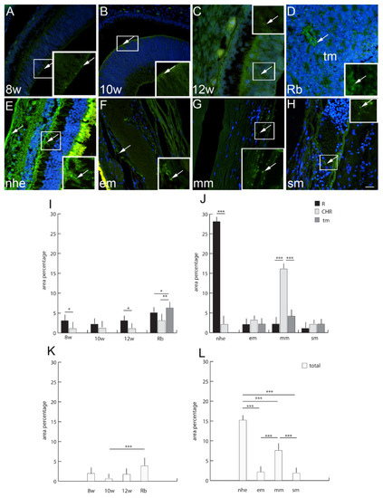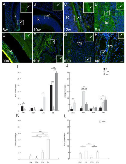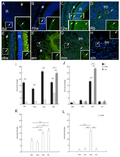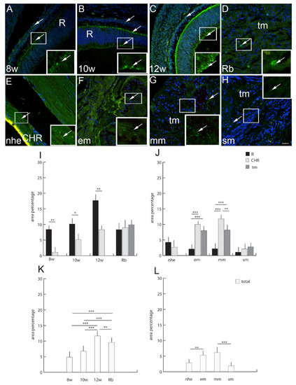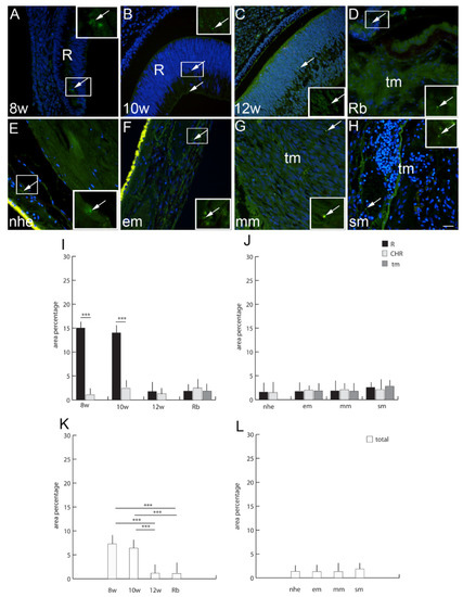 Panexin 1 (Pnx1)-positive cells (arrows) can be seen in the eye section of an 8th-week (8 w) (A), 10th-week (10 w) (B) and 12th-week (12 w) (C) human embryo, retinoblastoma (Rb) (D), normal human eye (nhe) (E), epitheloid melanoma (em) (F), mixoid melanoma (mm) (G) and spindle melanoma (sm) (H); R—retina, tm—tumor tissue. Immunofluorescence staining to Pnx1 (green) merged to DAPI (blue nuclei), scale bar 25 μm. The panel with graphs represents the area percentages of Pnx1 in the retina (R), choroid (CHR) and tumor (tm) in the 8th-week (8 w), 10th-week (10 w) and 12th week (12 w) human embryo, retinoblastoma (Rb), normal human eye (nhe), epitheloid melanoma (em), mixoid melanoma (mm) and spindle melanoma (sm) (I,J), and total area percentage of Pnx1 (K,L). Data are shown as mean ± SD. Significant differences are indicated by * p < 0.05, ** p < 0.01, and *** p < 0.001. One-way ANOVA followed by Tukey’s multiple-comparisons test (comparison between Rb and uveal melanoma types), t-test (comparison between retina and choroid of developmental stages and normal human eye).