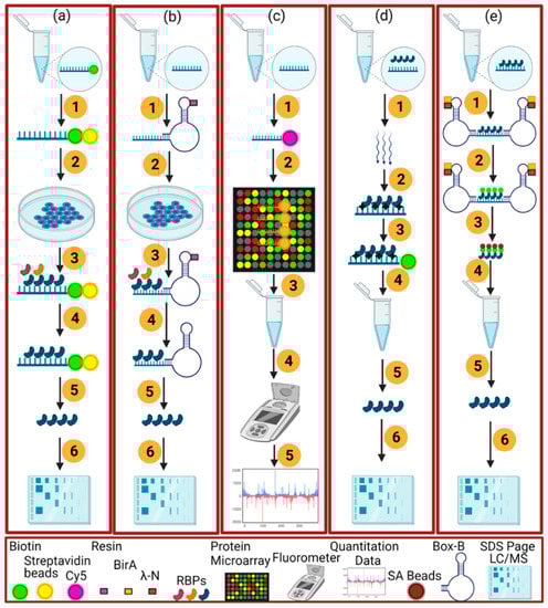 The graphical representations of the in vivo (a–c) and in vitro (e,d) RNA-centric methods. (a) the schematic of the end-biotinylated-RNA pulldown method which consists of these steps; biotin tagged RNA is transcribed in vitro and incubated with streptavidin beads (1), the addition of a cellular extract (2), the connection of RBPs with the associated RNA (3), non-targeted RBPs are washed (4), boiling of beads and RNase treatment to elute the RBPs (5), running of SDS-Page gel and mass spectrometry (6). (b) an aptamer-tagged RNA method to identify the RBPs in in vivo by not using the UV cross-linking mechanism as in (a). It consists of these steps, the linking of in vitro transcribed RNA with an RNA tag (blue) and resin (1), binding of RBPs with the RNA upon the addition of a cellular extract (2, 3), washing of specific and non-targeted RBPs (4), elution of the RBPs by using imidazole for Cys4 or biotin for the S1 aptamer method (5), LC/MS (6). (c) a protein microarray method followed by: in vitro RNA is transcribed by using the Cy5 (1), complex formation of RNA with the spotted 9400 proteins (2), washing of proteins (3), use of fluorescence meter to quantitate RNA bound with the microarray proteins (4, 5). However, (d) an in vitro UV cross-linking-based method as in plants (RIC, eRIC, OOPS) or other eukaryotes (RAP, PAIR, MS2-BioTRAP, TRIP). It consists of the UV cross-linking of RBPs inside the live cell (1, 2) the capturing of RBPs with the biotin (3), purification and isolation of RBPs (4, 5), SDS-Page gel and LC/MS (6). In the last (e), the non-UV cross-linking method RaPID is carried out by the following procedure: flanking of RNA with the BoxB RNA stem-loops (1), biotinylation of proteins by using the RaPID (LN-HA-BirA*) fusion protein linking with BoxB sites (2), capturing of biotinylated proteins with the SA beads (3), washing and elution of RBPs (4, 5) and SDS-Page Gel and LC/MS (6).