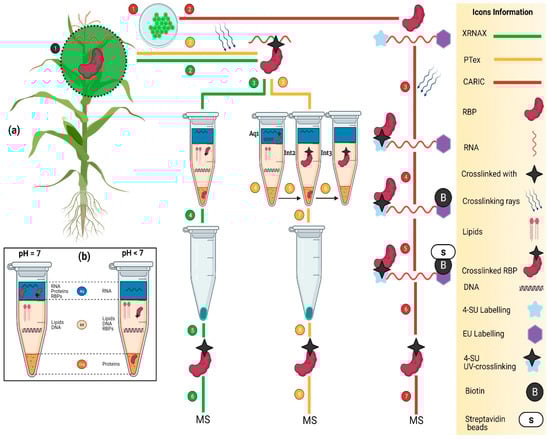 (a) the schematic representation of transcriptome-wide approaches to identify the RBPs. (Green line) is an XRNAX method that consists of a series of steps including plant growth (1), UV cross-linking (2), interphase aspiration, washing and DNase digestion (3), RBPs pellet collection (4), RBPs ready for MS (5), MS analysis (6). (Yellow Line) is the PTex method which works based on a differential pH as demonstrated in (a). It consists of a series of steps to isolate the RBPs including plant growth (1) and UV cross-linking (2). Three further differential enrichment steps are performed as follows: Phenol and Toluene (pH 7, PT 50:50); acidic phenol; and phenol, ethanol, and water (pH 4.8) numbered as (3–6), respectively. As a result of the differential enrichment scheme, RBPs are enriched as follows: aq1 > int2 > int3 in (4–6). In a final step (7), ethanol is added and centrifuged to precipitate the RBPs in pellet form. (Red line) shows the CARIC strategy in which plant cells (1) are grown in the presence of 4SU (sky blue star) and EU (purple star) (2), and several RNAs uptake them. As a result of UV cross-linking (365 nm), 4SU is activated and cross-links RNA with binders (black star) (3). After cell lysis, cells are labeled with biotin to tag the EU (4). Further RNase digestion and streptavidin bead-enrichment steps are performed to digest the RNA and release RBPs, respectively (4 and 5). RBPs are isolated (6) and ready for MS (7). (b) the description of RBP-enrichment at varying pH levels. At pH 7 and <5, RBPs are enriched in aqueous and interphase, respectively.