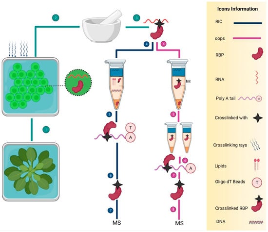 Two ribonomics methods to identify the RBPs in Arabidopsis. Navy blue and pink colored lines show the RIC and OOPS, respectively. On the right side, there is detailed information about the icons. (1), (2), and (3) are the common steps that show the cutting of Arabidopsis leaves into the tiny round-shaped cuttings, UV cross-linking, and grinding small cut leaves in liquid nitrogen, respectively. Next, all the steps are specific in both methods. RIC consists of a total of seven key steps: the extraction of UV cross-linked RBPs (4), employment of oligo-d(T) beads to capture the mRNA (5), RNase treatment to eliminate the RNA (6), and mass spectrometry for the sequencing of RBPs (7). However, the OOPS also consists of seven steps: isolation of RBPs from the interphase by using acidic guanidinium-thiocyanate-phenol (Trizol) and (Trizol: chloroform = 5:1 (v/v)), respectively (4), two-time purification of RBPs by the AGPC phase separation cycles and cryogenic treatment (5) RNase treatment to eliminate the bound RNAs (6), RBPs separation (7), and mass spectrometry (8).