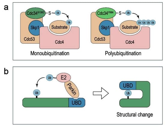 Proteins can be ubiquitinated in three ways, including monoubiquitination, multi-ubiquitination, and polyubiquitination, and different modifications exert different functions [,]. Whereas Lys48 (K48)-linked polyubiquitination typically results in proteasomal degradation of the target protein, monoubiquitination has been reported to confer stability to the substrate by inhibiting its polyubiquitination and degradation []. For instance, the HECT-type E3 ligase NEDD4-1 can promote both mono- and polyubiquitination of PTEN, with monoubiquitination protecting PTEN through nuclear import and polyubiquitination leading to its degradation in the cytoplasm []. The best-studied non-proteolytic ubiquitination is Lys63 (K63)-linked polyubiquitination, which regulates the substrate’s enzymatic activity (e.g., kinase activity) [] or subcellular localization []. The mechanisms that dictate whether a protein is monoubiquitinated or polyubiquitinated are not completely understood. One possibility is that the amino acids in the catalytic region of E2s and their compatibility with the residues surrounding the lysine residues in the substrate and ubiquitin serve as the determinants. In favor of this possibility, key residues in the catalytic core of the yeast E2–E3 complex Cdc34–SCFCdc4 dictate the lysine preference of Cdc34 and whether this complex monoubiquitinates or polyubiquitinates its substrate [,] (Figure 1a). Another possible mechanism is that the structural changes of the monoubiquitinated substrate restrict its further polyubiquitination. For example, the ubiquitin-binding domain (UBD) of the adaptor protein Eps15 is blocked after being monoubiquitinated by the RING-family E3 ligase Parkin, which limits ubiquitin chain extension [] (Figure 1b).