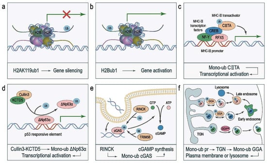 Monoubiquitination of transcription factors can modulate gene transcription by regulating protein–protein interaction, protein–DNA binding, and nuclear translocation. It has been shown that ubiquitin-mediated binding of transcriptional activators to gene promoters activates gene transcription. For instance, the major histocompatibility complex (MHC) class II transactivator, CIITA, which is recruited by MHC-II transcription factors (RFX5, CREB, and NF-Y) to the promoters of the three MHC-II genes, is monoubiquitinated. This ubiquitination of CIITA enhances its binding to both MHC-II transcription factors and the MHC-II gene promoters, leading to their transcriptional activation [] (Figure 2c).