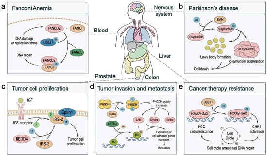 Diseases associated with dysregulated monoubiquitination. (a) In response to DNA damage or replication stress, the ubiquitin-conjugating enzyme UBE2T and the E3 ligase FANCL monoubiquitinate FANCD2 and FANCI, which facilitates the formation of the FANCD2–FANCI complex and DNA damage repair. In Fanconi anemia patients, impaired monoubiquitination of FANCD2 and FANCI results in DNA repair defects. (b) The E3 ligase SIAH monoubiquitinates α-synuclein, which promotes toxic α-synuclein aggregation, a hallmark of Parkinson’s disease. (c) In prostate cancer, NEDD4-induced monoubiquitination of IRS-2 enhances its association with Epsin1, which in turn promotes IGR receptor-mediated IRS-2 phosphorylation and cancer cell proliferation. (d) In colorectal cancer, the CUL4A-based E3 ligase complex monoubiquitinates and activates PHGDH, which increases the levels of serine, glycine, and S-adenosylmethionine (SAM). SAM promotes metastasis by upregulating cell adhesion gene expression via SETD1A-mediated histone methylation. (e) In liver cancer, UBE2T-mediated H2AX/γH2AX monoubiquitination activates CHK1 to promote DNA repair and radioresistance.