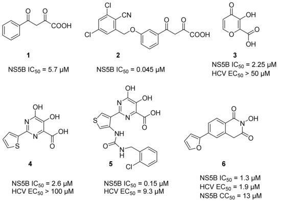 - Summa, V.; Petrocchi, A.; Pace, P.; Matassa, V.G.; De Francesco, R.; Altamura, S.; Tomei, L.; Koch, U.; Neuner, P. Discovery of α, γ-diketo acids as potent selective and reversible inhibitors of hepatitis C virus NS5b RNA-dependent RNA polymerase. J. Med. Chem. 2004, 47, 14–17. [Google Scholar] [CrossRef] [PubMed]