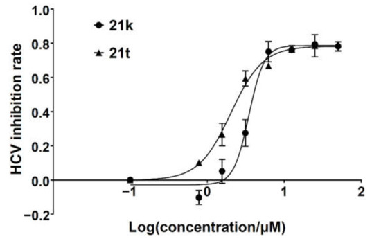 HCV inhibition fitting curves of compounds 21k and 21t.