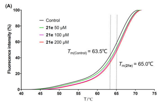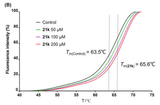 The stability of a protein system is enhanced after binding to its specific ligand, leading to an increase in the melting temperature (Tm). Taking advantage of this feature, the thermal shift assay was extensively used to assess the binding of small molecules to the protein targets [51,52,53]. The metal ion chelators were thought to exert an anti-HCV effect by chelating with Mg2+ in the catalytic center of NS5B [34,36,38]. Herein, to evaluate the binding of 3-hydroxyquinazoline-2,4(1H,3H)-dione derivatives with NS5B protein, representative compounds 21e and 21k with superior anti-HCV activities or good therapeutic indexes were selected and subjected to the thermal shift assay. C-terminal His-tagged NS5BΔ21 from HCV 1b subtype was used as the protein in the experiment. Compared with the blank control (DMSO), the fluorescence–temperature curves of the NS5B system in the presence of 21e (Figure 3A) and 21k (Figure 3B) at 50 μM, 100 μM, and 200 μM all shifted to the right of the axis. The Tm values of 21e and 21k increased in a concentration-dependent manner, presenting higher values than that of the blank control (Tm = 63.5 °C) at all tested concentrations. The addition of 200 μM 21e or 21k to the NS5B protein solution resulted in a shift in the melting temperature (ΔTm) with a value of 1.5 °C or 2.1 °C, respectively (Table 3), validating the binding abilities of 21e and 21k to NS5B. The co-crystal structure of NS5B complexed with ADP (PDB code: 4WTD) [8] proved that ADP could bind to the catalytic center of NS5B. Hence, ADP was chosen as the positive control in the thermal shift assay. As listed in Table 3, under the same experimental conditions, the ΔTm values of protein–ligand complexes containing ADP at the concentrations of 50 μM, 100 μM, and 200 μM were 0.44 °C, 0.62 °C, and 0.87 °C, respectively, which were significantly lower than the corresponding concentration groups of compounds 21e and 21k. These data indicated that the affinities of 21e and 21k to NS5B protein might be better than that of ADP. The thermal shift assay suggested that the metal ion chelators with 3-hydroxyquinazoline-2,4(1H,3H)-dione parent nucleus could inhibit the replication of HCV by binding to NS5B protein.