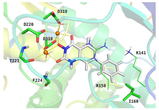 Magnesium ions play a central role as metal cofactors in a variety of enzymes, especially those involved in nucleic acid biochemistry [39,40]. In addition to HCV NS5B polymerase, the representative ones are HIV-1 integrase, HIV-1 ribonuclease H (RNase H), and influenza virus endonuclease. Targeting these metal cofactor-containing viral proteins to design and develop a series of metal ion chelators has been shown to be a practical and effective antiviral strategy [41,42,43,44,45,46,47]. To date, five HIV-1 integrase inhibitors (raltegravir, elvitegravir, dolutegravir, bictegravir, and cabotegravir) containing metal ion chelating structures have been approved by the FDA [48]. These encouraging results confirm that the metal ion chelation strategy has a broad prospect in the development of HCV DAAs.