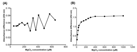 Absorbance increasement at 254 nm of the methanol solution containing 50 μM 21e in the presence (A) or absence (B) of NaOAc caused by the addition of ascending concentrations of MgCl2. (A) Absorbance difference at 254 nm obtained by subtracting the absorbance of the control group (50 μM 21e) from that of the sample group (50 μM 21e, 40–640 μM MgCl2) containing MgCl2. (B) Absorbance difference at 254 nm obtained by subtracting the absorbance of the control group (50 μM 21e, 5 mm NaOAc) from that of the sample group (50 μM 21e, 5 mm NaOAc, 10–1000 μM MgCl2) containing MgCl2.