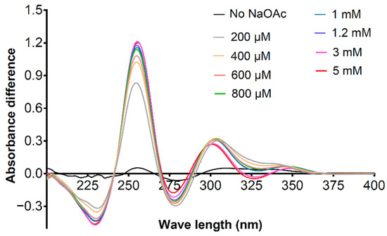 The differential ultraviolet-visible (UV-Vis) spectra caused by the addition of 80 μM MgCl2 in the presence of 0–5 mm NaOAc. The differential spectra were obtained by subtracting the absorbance of the control group (50 μM 21e, 0–5 mm NaOAc) from that of the sample group (50 μM 21e, the same concentration of NaOAc as in the control group, 80 μM MgCl2) at the corresponding wavelength (200–400 nm). Methanol was used as the solvent.