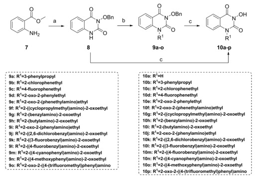 In this study, we synthesized a series of novel metal ion chelators with 3-hydroxyquinazoline-2,4(1H,3H)-dione parent nucleus. Based on the strategy of partition structure modification, we first tried different substituents on the 1-nitrogen of hydroxyquinazolinedione core to explore the preliminary structure-activity relationship (SAR) (Scheme 1). Further, structural modifications at the phenyl ring region of the parent nucleus were implemented (Scheme 2). As shown in Scheme 1, the starting material, methyl anthranilate 7, underwent a one-pot two-step reaction to give the key intermediate 3-(benzyloxy)quinazoline-2,4(1H,3H)-dione (8). Initially, methyl anthranilate 7 was condensed with 1,1′-carbonyldiimidazole (CDI) and benzyloxyamine successively to introduce the carbonyl fragment. Then the intermediate 8 was obtained after the intramolecular cyclization reaction under a strongly alkaline environment. In step b, the intermediate 8 and the corresponding halide underwent an alkylation reaction with various substituents introduced on the N-1 position to yield compounds 9a–o. Finally, to obtain the target compounds N-1 substituted 3-hydroxyquinazoline-2,4(1H,3H)-diones (10a–p), the benzyl groups in 8 and 9a–o were removed using different conditions of deprotection, i.e., heating in hydrobromic acid/acetic acid mixture under reflux, or palladium-carbon catalyzed hydrogenation.