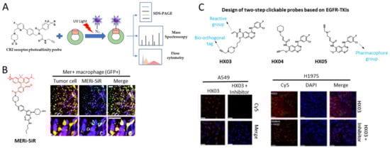 Kinases belong to a subgroup of transferase enzymes that are capable of transferring phosphate groups to acceptor proteins. Exploring the functions of kinases is important for understanding the potential roles of cancer signaling pathways. Small cell lung cancer (SCLC) involves several kinases that play a role in cancer progression. Desthiobiotin-ATP probes were developed to target kinase regulators that occur in 21 SCLC cell lines. The results revealed that, in SCLC cells, aurora kinase B is a critical kinase for MYC amplification, and TANK-binding kinase 1 (TBK1) is crucial for cancer cell viability, G2/M arrest, and apoptosis []. Zhang et al. synthesized a red-emitting probe called NB-BF to monitor Pim-1 kinase trafficking in cancer cells in vivo []. Moreover, tyrosine kinase Mer (MERTK) is a potential drug target for cancer and plays a role in the enhancement of the metastasis signaling cascade in tumor cells. Interestingly, a near-infrared fluorescent (NIR) molecular probe for Mer (MERi-SiR) was developed to monitor metastatic conditions in a mouse model system (Figure 2B) []. G-protein-coupled receptors (GPCRs) are key regulatory factors in cancer prognosis. Contextually, a photoreactive probe, namely, LEI121, was used to target type 2 cannabinoid receptor (CB2R), a class of GPCR; LEI121 covalently binds to CB2R. Upon photoactivation of this probe, it binds to endogenously expressed CB2R in HL-60 cells to monitor CB2R activity (Figure 2A) []. Bush et al. developed a series of photoaffinity probes (P1-P10) for selective binding to members of the cyclin-dependent kinase (CDK) family []. A series of clickable probes, namely HX03, HX04, and HX05, were synthesized to bind to epithelial growth factor receptor–tyrosine kinase inhibitors (EGFR-TKIs) found in non-small cell lung cancer (Figure 2C) []. To detect HER1/HER2 expression, Cy3-AFTN and Cy5-AFTN dual-targeting probes were developed to facilitate the diagnostic imaging of cancer cells in vivo (Figure 3) []. Similarly, to enable targeting of the B cell receptor (BCR) signaling mediator Bruton’s tyrosine kinase, a dual-purpose probe, IB-4, with both imaging and inhibitory activities, was developed [].