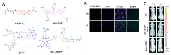 Histone deacetylases (HDACs) detecting probes. (A) Chemical structures of histone deacetylases (HDACs)-detecting probes. (B) Fluorescence images of HeLa cells incubated with CyAc-RGD probe. (C) Imaging of CyAc-RGD probe in tumor induced mice. (B,C) Reprinted with permission from []. Copyright 2018, The Royal Society of Chemistry.