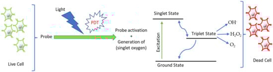 Application of chemical probes in photodynamic therapy (PDT). The photosensitive probe absorbs light and changes the ground-state energy status to single-state energy. By intersystem crossing energy exchange, it reaches the excited triplet state and generates OH−, H2O2, and O2, which ultimately lead to cancer cell death.