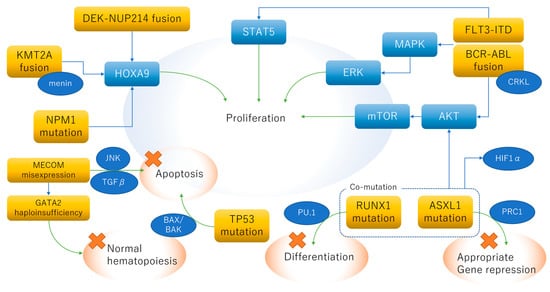 The pro-leukemic mechanisms of adverse genetic factors are schematically summarized in Figure 1. The upregulation of HOXA9 is a common phenomenon in AML with KMT2A rearrangement, NPM1 mutation, and DEX-NUP214 fusion. The aberrant tyrosine kinase activity of FLT3-ITD and BCR-ABL1 fusion affects three major signaling pathways: the AKT-mTOR, MAPK-ERK, and STAT5 pathways. Suppressed apoptosis is caused by TP53 mutation and MECOM mis-expression.