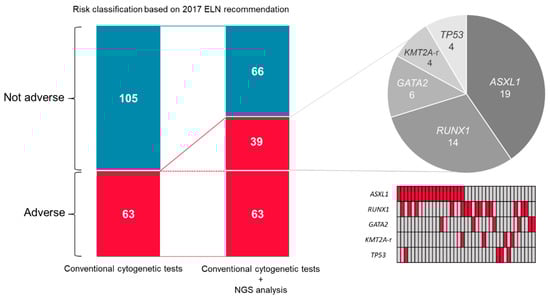 Detailed analysis of the published data of HM-SCREEN-Japan 01 [,]. Among 168 patients whose chromosomal status was known, 63 patients (37.5%) were classified as adverse risk according to the ELN2017 criteria by applying conventional cytogenetic tests only. An additional 39 patients (102 total patients (60.7%)) were classified as adverse risk after referring to the NGS results. Adverse genetic factors of the additional 39 cases were ASXL1 mutation in 19 patients (48.7%), RUNX1 mutation in 14 patients (35.9%), GATA2 mutation in 6 patients (15.4%), KMT2A rearrangement in 4 patients (10.3%), and TP53 mutation in 4 patients (10.3%).