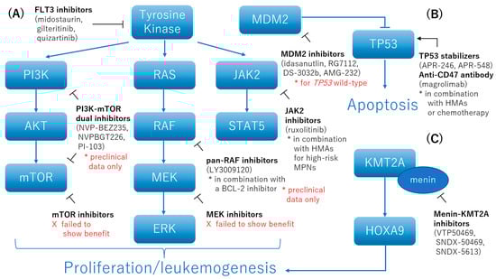 A summary of molecular-targeted agents for AML with adverse genetic factors. (A) FLT3-ITD and BCR-ABL1 activate the PI3K-AKT-mTOR, RAS-MAPK-ERK, and JAK2-STAT5 pathways to promote leukemic proliferation and leukemogenesis. FLT3 inhibitors (e.g., midostaurin, gilteritinib, and quizartinib) have demonstrated clinical benefit for front-line use in combination with standard induction chemotherapy. Dual PI3K-mTOR inhibitors (e.g., NVP-BEZ235, NVPBGT226, and PI-103) induced cell cycle arrest and apoptosis of leukemic cells in preclinical studies. A pan-RAF inhibitor (LY3009120) led to the downregulation of MCL-1 and showed synergistic anti-leukemic activity in combination with a BCL-2 inhibitor. The combination of ruxolitinib, a JAK2 inhibitor, and decitabine, an HMA, showed high response rates with good tolerability in patients with high-risk MPNs. (B) TP53 normally regulates the cell cycle, DNA repair, and apoptosis, and MDM2 counteracts these functions. A first-generation TP53 stabilizer, APR-246, in combination with azacitidine failed to show statistically significant superiority in patients with TP53-mutated MDS in a phase 3 study. However, a next-generation TP53 stabilizer, APR-548, is now under evaluation in an early-phase trial. CD47 is an immune-regulatory tumor antigen that inhibits phagocytosis in macrophages. Although the mechanism of CD47 inhibition is dependent on TP53 function, an anti-CD47 antibody, magrolimab, in combination with azacitidine has demonstrated equal effectiveness in patients with AML regardless of TP53 mutation status. (C) AML with KMT2A rearrangement, NPM1 mutation, or DEK-NUP214 fusion genes depends on the upregulation of HOXA9, which is initiated by the interaction of menin and KMT2A protein. A menin-KMT2A inhibitor, SNDX-5613, has shown promising results as a monotherapy in patients with relapsed/refractory AML with KMT2A rearrangement or NPM1 mutation. PI3K: phosphatidylinositol 3-kinase, AKT: AKT serine/threonine kinase 1, mTOR: mechanistic targets of rapamycin, MEK: mitogen-activated protein kinase kinase, ERK: extracellular signal-regulated kinases, JAK2: Janus kinase 2, STAT5: signal transducer and activator of transcription 5, MDM2: mouse double minute 2, TP53: tumor protein p53, KMT2A: lysine methyltransferase 2A, HOXA9: homeobox protein A9.