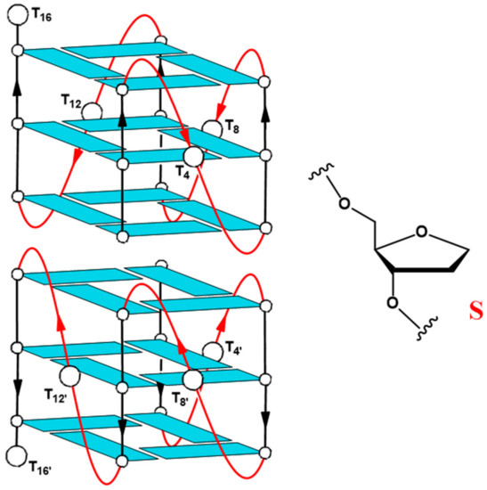 It would be necessary to have a novel more specific strategy targeted against cancer cells and less detrimental for the organism than traditional genotoxic plans of chemotherapy. Innovative approaches that work by mechanisms dissimilar from existing therapies, especially those that can target multiple pathways involved in cancer cell survival, may hence be valuable in the treatment of advanced cancer [1]. Quite recently, it was demonstrated that G-rich oligonucleotides (GRO) can show interesting biological properties against different types of tumor cells [2,3,4,5,6]. Repetitive G-rich sequences, commonly expressed in nucleic acids, are able to adopt G-quadruplexes (G4s), typical four-stranded and very stable non-B DNA nucleic acid secondary conformations [7]. The core unit of a G4 is a planar squared arrangement of four guanines (G-tetrad) stabilized by Hoogsteen hydrogen bonds and stacked between them [8]. The secondary structures of DNAs are essential for their function and G4s are widespread in the human genome [9,10], especially in promoter regions and telomere ends [11,12]. Even though the significance of G4 structures in living cells was the subject of controversy in the past, the collection of more recent experimental data corroborates the presence and relevance of these conformations in living cells [13,14]. In addition, the number of reports describing specific proteins able to bind and unfold G4 structures is now considerable, supporting their physiological importance as well [13,14]. Exogenous G-rich oligomers forming stable G4 structures under physiological conditions can recognize these proteins, acting as aptamers. Aptamers are usually created by selecting them from a large random sequence pool through Systematic Evolution of Ligands by EXponential enrichment (SELEX) [15]; however, it is possible to find them in their “natural form” in riboswitches [16]. Aptamers are artificial single-chained DNA or RNA oligonucleotides that are generally 20- to 80-nucleotides-long, which are able to adopt distinctive three-dimensional (3D) structures thanks to several intramolecular interactions [17], such as the very stable nucleic acid secondary conformations G4s in the presence of G-rich sequences and appropriate metal cations. The high binding affinity and specificity of G4-aptamers, among other characteristics, have made them one of the most investigated classes of compounds in diagnostic and therapeutic research areas [18]. One such example is the already known DNA aptamer T30923 (or its partially phosphorothioate version, T30695) [G3(TG3)3T] [19], which was revealed to fold into a dimeric G4, formed by the head-to-head 5′-5′ stacking of two identical propeller-type parallel-stranded G-quadruplex subunits, which is particularly interesting because of its aptitude to target with high affinity two different not related proteins, namely the HIV-1 integrase (HIV-IN) [20,21] and the interleukin-6 receptor (IL-6R) [22].