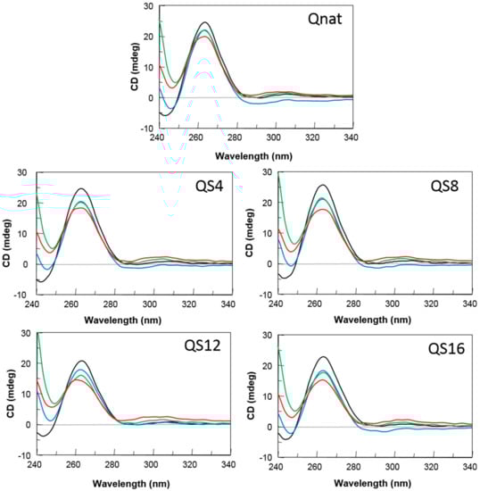 CD spectra of Qnat and its analogues in 10% fetal bovine serum (FBS) diluted with Dulbecco’s Modified Eagle’s Medium (DMEM), registered at 0 (black), 24 (blue), 48 (green), and 72 h (red) at 37 °C. See the main text and the Materials and Methods section for details.