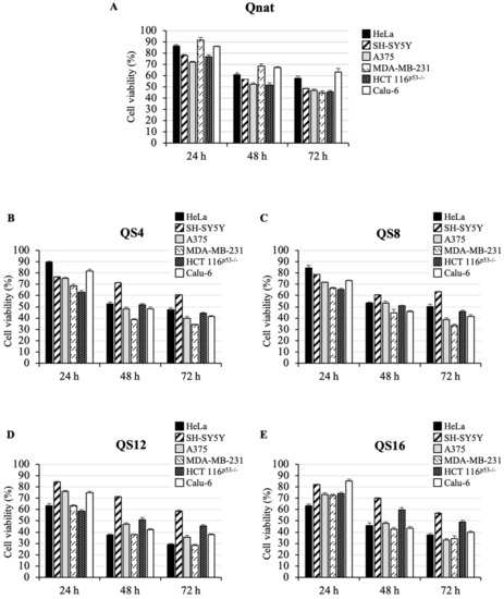 Notably, Qnat analogues showed a higher cytotoxic activity than the unmodified original aptamer, in almost all cases, apart from the SH-SY5Y cell line. The most pronounced cytotoxic effects were found after 72 h at 50 μM in A375, MDA-MB-231 and Calu-6 cell lines for QS4 and QS8, instead in A375, MDA-MB-231 and Hela for QS12 and QS16. At the same time point, a reduction in cell viability from 50% in Qnat treated cells to 30–40% in the analogues treated A375 and MDA-MB-231 cells was observed; while, in Calu-6 cells, a decrease in cell viability from 65% in Qnat-treated cells to 40% in Qnat derivatives treated cells was found.