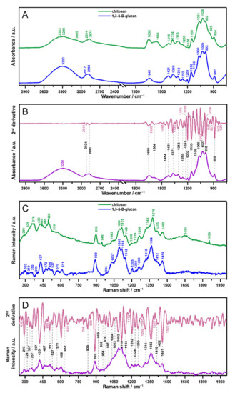 ATR FT-IR (A,B) and Raman (C,D) spectra of separate components of the polymeric matrix, gelled films of chitosan and 1,3-β-d-glucan (A,C); the relative intensity of hybrid chitosan/1,3-β-d-glucan spectra along with the second derivatives of the spectra in the entire measured range (B,D).