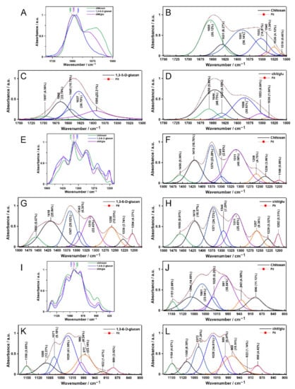 In the 1750–1500 cm−1 ATR FT-IR spectral range (Figure 2A), most evident is the absence of an amide II band for the 1,3-β-d-glucan. Instead, a small percentage band occurs at 1697 cm−1, which can be assigned to C=O stretching coupled to the NH2 scissoring and N–H in-plane bending vibrations (Figure 2C) [28]. Compared to the 1,3-β-d-glucan, in the spectrum of chitosan/1,3-β-d-glucan matrices, a band at 1645 cm−1 related to C=O carboxylic groups and C=C stretching vibration of rings [29] shifts to 1646 cm−1 and a band at 1627 cm−1 derived from stretching of the C=O group [29] shifts to 1632 cm−1. In turn, compared to chitosan, in the spectrum of chitosan/1,3-β-d-glucan polymers, the band at 1591 cm−1 ascribed to C–O vibrational bending [30] shifts to 1586 cm−1, and the band at 1553 cm−1, mainly related to in-plane amine N–H bending coupled to amine C–N stretching vibrations of amines [31], is at the same wavenumbers (Figure 2D). In chitosan (Figure 2B), a band with a minimal percentage share occurs at 1510 cm−1, corresponding to the stretching asymmetric vibrations of the C–N group [32]. In the 1500–1180 cm−1 infrared range (Figure 2E), chitosan/1,3-β-d-glucan (Figure 2H) and 1,3-β-d-glucan (Figure 2G) show a similar course of deconvolution, with only slight shifts and a modest percentage of differences. The profile of deconvolution in the case of chitosan (Figure 3F) differs insignificantly; here, a larger share of the 1311 cm−1 band attributed to the stretching vibration of N–H, C–N and C–O for the amide III bond and a smaller share of the 1349 cm−1 band assigned to the CH2 wagging mode [33] is observed. In the 1200–800 cm−1 FTIR range (Figure 2I), the situation is similar; spectral deconvolution for the 1,3-β-d-glucan (Figure 2K) and the chitosan/1,3-β-d-glucan (Figure 2L) has a comparable course and is characterized by the different pattern for the chitosan sample (Figure 2J). There is a smaller share and a shift towards the lower wavenumber of the band at 1025 cm−1 and a much larger share of the band at 991 cm−1; these two regions are associated with the C–O stretching mode [34]. There is also no 922 cm−1 band here connected with the C–H deformation of β-glycosidic linkages, but there is an additional 940 cm−1 band assigned to the O–H out-of-plane deformation [34].
