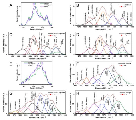 In the 1300–1500 cm−1 Raman range (Figure 3A), chitosan/1,3-β-d-glucan deconvolution is the combination of both chitosan (Figure 3B) and 1,3-β-d-glucan (Figure 3C) profiles. Noteworthy is the broadened band at 1351 cm−1 in chitosan, accounting for almost 31% of the area of all bands, and an additional small band at 1302 cm−1 attributed to CH2 wagging and the CH deformational [35], respectively (Figure 3B). In the 1000–1200 cm−1 Raman region (Figure 3D), the deconvolution pattern shows a characteristic broadening at 1086 cm−1 (chitosan, Figure 3F), 1055 cm−1 (1,3-β-d-glucan, Figure 3G) and 1138 cm−1 (chitosan/1,3-β-d-glucan, Figure 3H) associated with C–N stretching, C–O stretching and C–H deformational vibrations, respectively [36]. In the 1,3-β-d-glucan profile, there are two bands at 1063 and 1074 cm−1 (Figure 3G), which disappear in chitosan/1,3-β-d-glucan (Figure 3H), forming one peak at 1066 cm−1 connected with C–C stretching and C–H bending [36]. The ATR FT-IR and Raman results show that C=O⋯HN moieties in the N-acetylglucosamine groups of chitosan are particularly involved in the polymerization process with 1,3-β-d-glucan units.