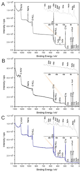X-ray photoelectron spectroscopy (XPS) measurements were carried out with the use of a Microlab 350 (Thermo Electron Corporation, Beverly, MA, USA) spectrometer with non-monochromatic Al Kα radiation (hν = 1486.6 eV) as an X-ray source operating at 2 × 5 mm spot size, 300 W and 15 kV. The high-resolution (HR) XPS spectra were recorded by a hemispherical analyzer at a pass energy of 40 and an energy step size of 0.1 eV. In order to evaluate the XPS data, the Thermo Scientific Avantage software (version 4.88, Waltham, MA, USA) was applied. Deconvolution of HR XPS spectra was performed by applying a smart-type background and a Gaussian peak shape with 35% Lorentzian character. The measured binding energies were corrected relative to the energy of carbon peak (C1s) at 284.6 eV.