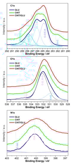 The profiles of the N1s and O1s peaks in the spectra of all investigated samples (Figure 5) are similar, indicating certain similarities within the type and the distributions of the most abundant surface species in these materials. As was suggested previously, this fact is most likely determined by the surface structure and topology, which may promote the formation of certain surface species/functions to balance the surface charge of the system [12]. This data agrees with the spectroscopic results, which indicate that the chitosan/1,3-β-d-glucan matrices caused modifications in the molecular arrangement and are consistent with spectroscopic observations showing that the hybrid chitosan/1,3-β-d-glucan samples reveal alterations in the molecular configuration.