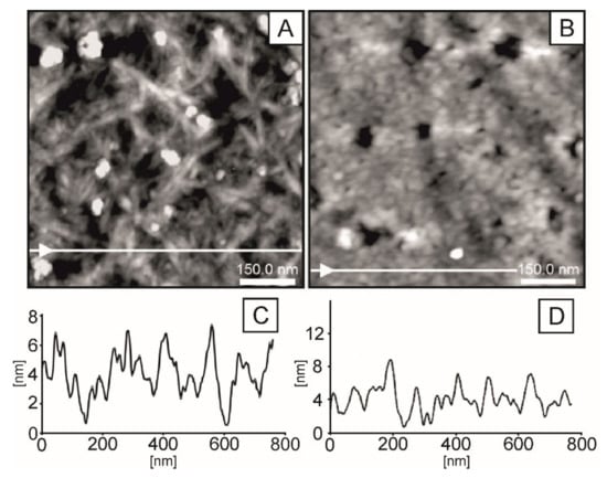 In the images presented in Figure 6, parts (A), (C) correspond to the glucan sample thermally gelled at 90 °C. Parts (B) and (D) correspond to the chitosan sample gelled in NaOH and subjected to high temperatures (90 °C). The production conditions were the same as for the chitosan/glucan sample. Both images show developed morphology. The glucan sample is characterized by a fibrous structure. In these cases, single fibres are easily distinguished on the AFM images as bright lines. The width of the observed longitudinal structures is in the range of 12–18 nm; however, this dimension can be overestimated by the shape of the AFM tip. The fibres are randomly distributed and mutually intertwined.