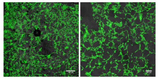 A cytotoxicity assessment of the produced chitosan/1,3-β-d-glucan film was performed by using live/dead staining of human skin fibroblasts (BJ cell line) cultured on the surface of the film for 48 h. Obtained confocal laser scanning microscope (CLSM) images showed a great number of viable cells (green fluorescence) (Figure 8). The cells were well flattened and attached to the surface of the produced film, confirming its non-toxicity.