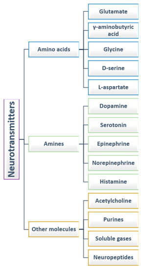There have been identified various types of NTs, with different functions produced in different regions of the brain []. From the point of view of their chemical nature, NTs are commonly divided into amino acids, amines, and other molecules. While depending on their activities, they can be of two types: positive and negative NTs or central and peripheral NTs []. The first classification is considered in the following subsections, as visually summarized in Figure 1.