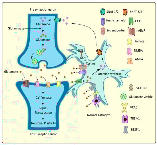 An essential role in maintaining proper extracellular levels of glutamate through release and uptake mechanisms is played by astrocytes. These cells mediate glutamate uptake and convert a part of it to glutamine, further transporting it to the presynaptic neurons, while certain amounts of the glutamate are released into the extracellular regions via different pathways. These processes regulate the glutamate homeostasis at the tripartite glutamatergic synapse [] (Figure 2).