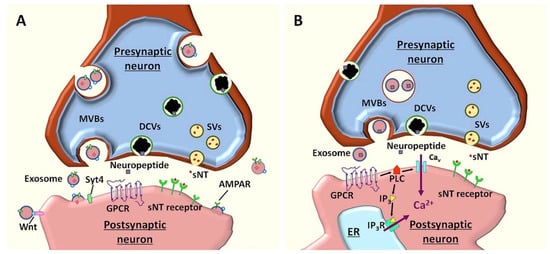 (A) Schematic representation of the function of neuronal exosomes as neuromodulators. In neurons, MVBs fuse with the plasma membrane without being restricted to the synaptic specialization and release exosomes into extracellular spaces, including the synaptic cleft. Through their various cargos, exosomes regulate synaptic plasticity. (B) The proposed models for neuronal exosomes as neurotransmitters. In response to action potentials, exosomes are released from the presynaptic neuron. As they carry neuropeptides and other ligands, exosomes activate GPCRs and downstream signaling cascade, leading to Ca2+ release from ER. Reprinted from an open-access source []. Abbreviations: AMPAR—alpha-amino-3-hydroxy-5-methyl-4-isoxazolepropionic acid receptor; DCV—dense core vesicles; ER—endoplasmic reticulum; GPCR—G protein-coupled receptors; IP3—inositol 1,4,5-triphosphate; IP3R—IP3 receptor; MVB—multivesicular bodies; PLC—phospholipase C; sNT—small neurotransmitter; SV—synaptic vesicles; Syt4—Synaptotagmin-4.