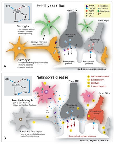 Glutamate and dopamine-related striatal events—focus on astrocytes and microglia functions in (A) healthy state, (B) Parkinson’s disease (PD) condition. Grey box: fronto-basal circuits involved in the modulation of voluntary movements and impaired connectivity caused by dopamine degeneration in PD. Reprinted from an open-access source []. Abbreviations: AMPA—alpha-amino-3-hydroxy-5-methyl-4-isoxazolepropionic acid; CTX—cerebral cortex; Cys—cysteine; EEAT—excitatory amino acid transporter; GPe—external segment of the globus pallidus; GPi—internal segment of the globus pallidus; GSH—glutathione; mGluR—metabotropic glutamate receptor; NMDA—N-methyl-D-aspartate; SNpc—substantia nigra pars compacta; SPN—spiny projection neuron; STN—subthalamic nucleus; xC—cysteine–glutamate exchange system.