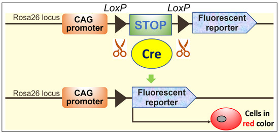 The mechanism of cell lineage tracing. The Cre excises the STOP sequence, and it activates the tomato reporter in the specific cell line when the mouse has both the Cre and loxP expression. As a result, this specific cell lineage is labeled in red color.
