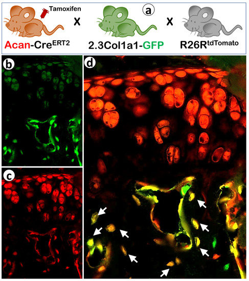Cellular co-localization of the chondrocyte-derived tomato marker and a 2.3 Col1a1-GFP osteoblast-specific marker in the TMJ condyle cartilage and underlying trabecular bone. (a) The schematic diagram illustrates the generation of triple mice containing Acan-CreERT2, 2.3Col1a1-GFP, and R26RtdTomato along with a tamoxifen induction to activate the Cre event. (d) Confocal images of the GFP (b) and Tomato (c) signals in the articular cartilage of a 6-week-old mouse. (c) The merged image of GFP and Tomato signals, which revealed non-chondrocyte-derived bone cells (green), chondrocyte-derived bone cells with no GFP activation yet (red), and chondrocyte-derived bone cells expressing type I collagen (yellow as denoted with arrows).