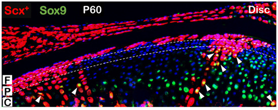 Apart from the direct role of tendon lineage to bone formation in normal and disease states, it has also been discovered that tendon cells directly contribute to fibrocartilage formation in mandibular condyles. Ma et al. found that Scx+ tendon cells form a subset of chondrocytes in TMJ condyle cartilage via two steps: Scx+ tendon cells in fibrous layer first form dendritic prechondroblasts and subsequently transdifferentiate into Scx+ chondrocytes [106] (Figure 3). This transdifferentiation was found not only in early postnatal development where tracing started from postnatal day 3, but also in adulthood, where tracing began from postnatal day 28. Interestingly, these tendon-derived chondrocytes do not transdifferentiate into bone cells as the non-tendon-derived chondrocytes do [10,24]. Furthermore, the Scx+ derived chondrogenesis, similar to non-Scx+ derived chondrocytes [87], is highly sensitive to changes in phosphorus levels as demonstrated in the Dmp1 KO mice. In addition, the group also stated that the TMJ disc, which is composed of dense fibrocartilagenous tissue, solely originates from tendon lineage.