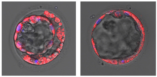 Aneuploid blastocysts. Mitochondria are stained red (MitoTracker Red CMXRos) and nuclei are stained blue (DAPI).