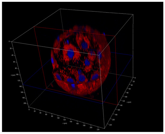 Aneuploid blastocyst in 3D cross-section. Mitochondria are stained red and nuclei are stained blue.