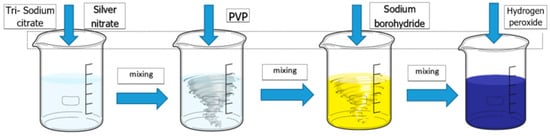 A solution of silver nitrate (0.1 mM) was prepared in 500 mL deionized water in a 1000 mL flask, then was added 30 mL tri-sodium citrate dihydrate (3 × 10−2 M) solution mixed vigorously (600–700 rpm) after 10 min was added 30 mL of PVP solution 0.7 mM and various volumes of sodium borohydride. The mixture was magnetic stirring for 2–3 min, at room temperature then added 1–3 mL hydrogen peroxide 35% (Figure 1). The concentration of obtained samples is 10 ppm. The obtained samples were coded with RT1 to RT3 mentioned in the Table 1.