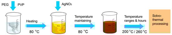 The present work proposes two synthesis methods (i) chemical reduction at the room temperature using reducing agents, such as sodium borohydride at different concentrations and tri-sodium citrate. The stabilizing agent polyvynilpirrolidone (PVP) has a role to prevent the agglomeration of nanoparticles during synthesis or deposit them []. It was noticed that the PVP capping agent plays an important role in controlling the ratio growth rates for 100 and 111 facets [,,] resulting in the formation of nanocubes and nanorods shapes. Adding the hydrogen peroxide in the last stage of experiment has a role to prevent the oxidation of small particles into Ag+ [,]. (ii) The chemical reduction at the raised temperature named solvothermal method using polyethylene glycol (PEG) as solvent and capping agent. This route follows the influence of different temperatures (200–260 °C) and reaction time on the silver nanoparticles formation, more precisely shapes, sizes, and consequently the antimicrobial activity. The polyethylene glycol 400 (PEG), with polyvinylpyrrolidone (PVP) are used both as a stabilizing agent [,,,].