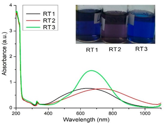 The samples obtained by chemical reduction at room temperature encoded RT show peaks around the value of the wavelength of 320 nm indicating the ions silver presence [] and peaks around values 600–800 nm indicating the presence of silver nanoparticles with anisotropic shapes. Instead of a single peak about 400–420 nm values, characteristic of spherical particles [,] two peaks appeared indicating different shapes than spherical shapes and confirmed by the predominated blue color of the obtained solutions (Figure 3). Various colors of the obtained nanoparticles solutions encoded RT result from the surface plasmon resonance of nanoparticles indicating by their color a certain shapes and sizes. Shifting the plasmon resonances to values of wavelength 600–800 nm (Figure 3) indicating an increasing of silver nanoparticles sizes and modified their shapes to the triangular or bipyramidal shapes [].