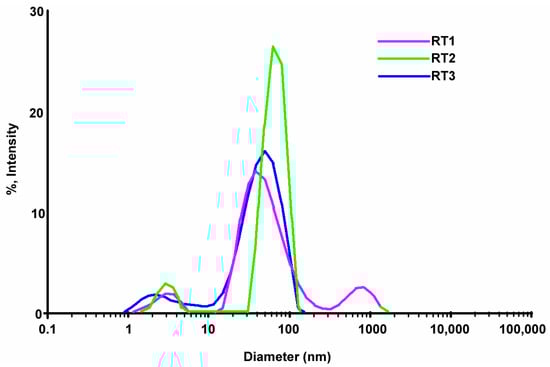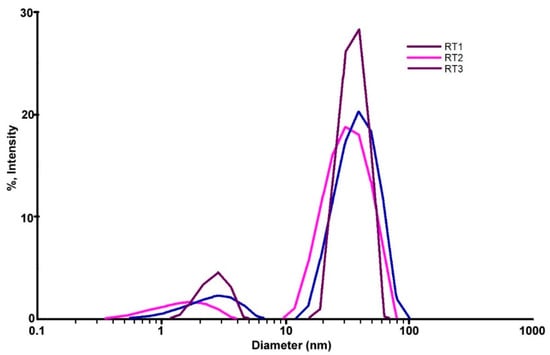 According to the DLS obtained results after 8 months from the first test it can be seen all samples have multimodal dispersity (Figure 5). All samples show a slight tendency of NPs agglomeration. The sample coded with RT3 registered a higher peak comparing with the sample RT1 and RT2. The encoded sample RT3 showed a diminished quantity of nanoparticles formed with size less than 10 nm, but we noticed an increasing nanoparticle with sizes over than 50 nm. The graphics show a multimodal distribution less the sample RT3 (Figure 5). Samples RT1 and RT2 show a higher agglomeration of particles with size higher than 50 nm. Probably, a higher or lesser added quantity of the reducing agent lead in time, to the various morphologies and sizes with agglomeration tendency. According to the information received from DLS results the polydispersity of the obtained nanoparticles could affect the antimicrobial activity [,,].